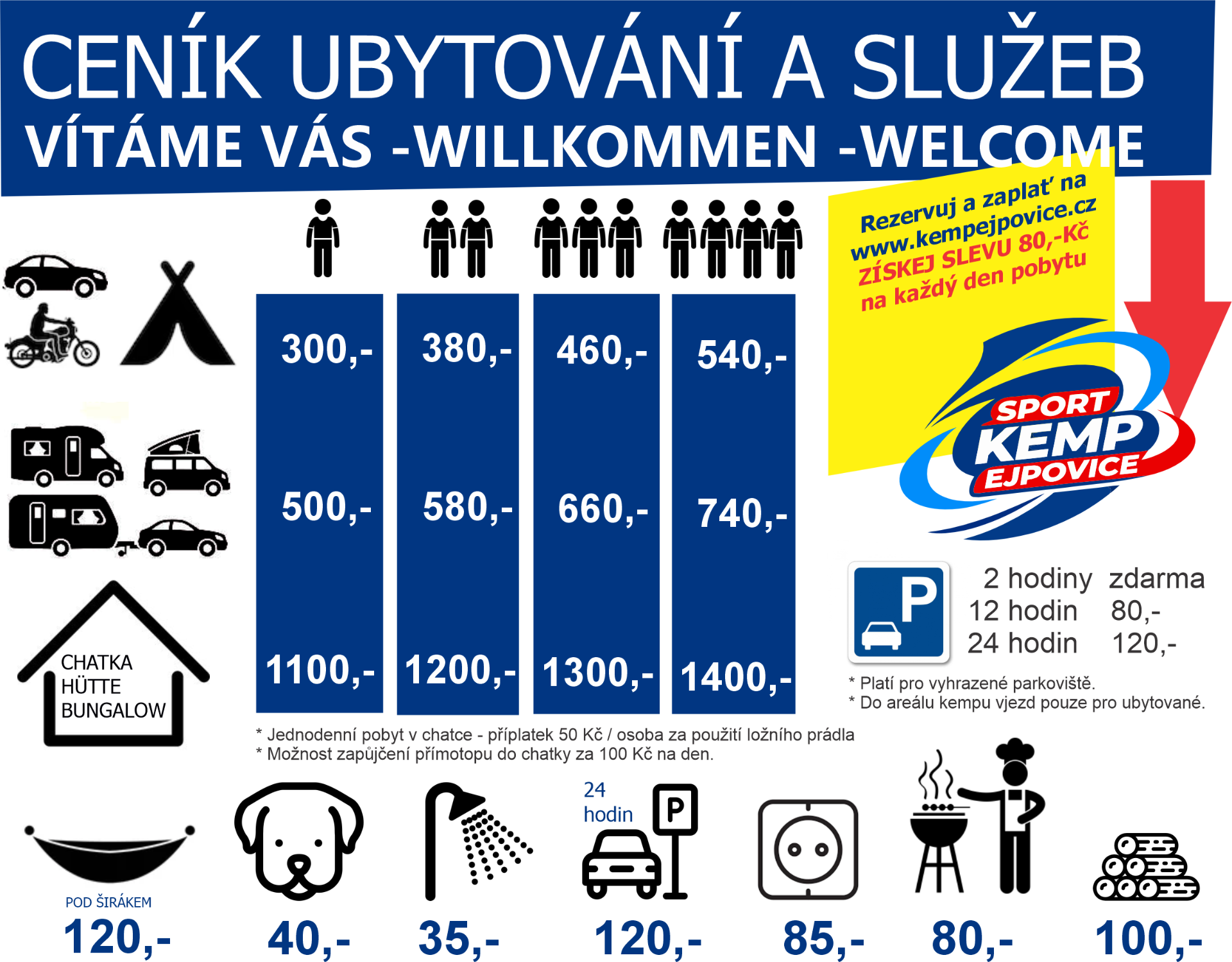 Kemp u Ejpovického jezera Mezi Plzní a Rokycany, v krásné krajině této turisticky přitažlivé a historicky zajímavé oblasti západních Čech, se u Ejpovického jezera rozkládá prostorný areál kempu. Hosté zde naleznou příležitost ke koupání, provozování vodních sportů, rybaření, k vycházkám do nedalekých lesů i k vyjížďkám do blízkého či vzdálenějšího okolí, ať už půjde o prohlídku Plzně či Rokycan a jejich pamětihodností, nebo o návštěvu četných hradů a zámků. Autokempem prochází cyklostezka Praha – Plzeň, díky čemuž je areál výborně dostupný pro cyklisty a slouží jako ideální výchozí bod pro poznávání regionu. Klidná atmosféra, blízkost vody a okolní přírody vytvářejí příjemné prostředí pro rodiny s dětmi, skupiny přátel i jednotlivce, kteří hledají odpočinek i aktivní dovolenou. Kemp u Ejpovického jezera nabízí zázemí pro krátkodobé i delší pobyty a je vhodný pro milovníky kempování ve stanech, karavanech i obytných vozech. Díky své poloze a širokým možnostem vyžití představuje atraktivní místo pro letní dovolenou, víkendový pobyt i zastávku na cestách po západních Čechách. Stačí si vybrat termín, přijet k Ejpovickému jezeru a užít si pobyt v kempu, kde se spojuje příroda, pohoda a pestré možnosti trávení volného času.